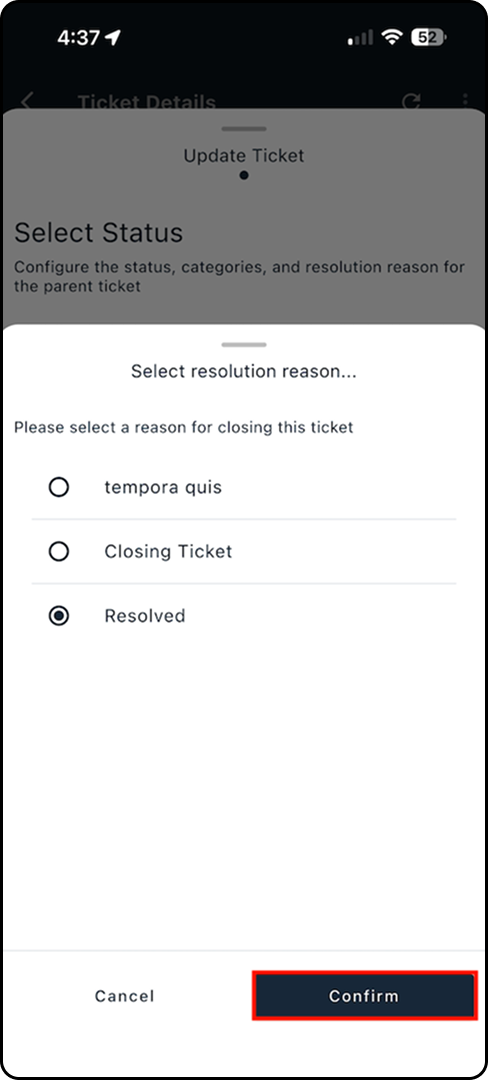 7. Next to Resolution Reason, tap Edit and choose the reason, and click Confirm.