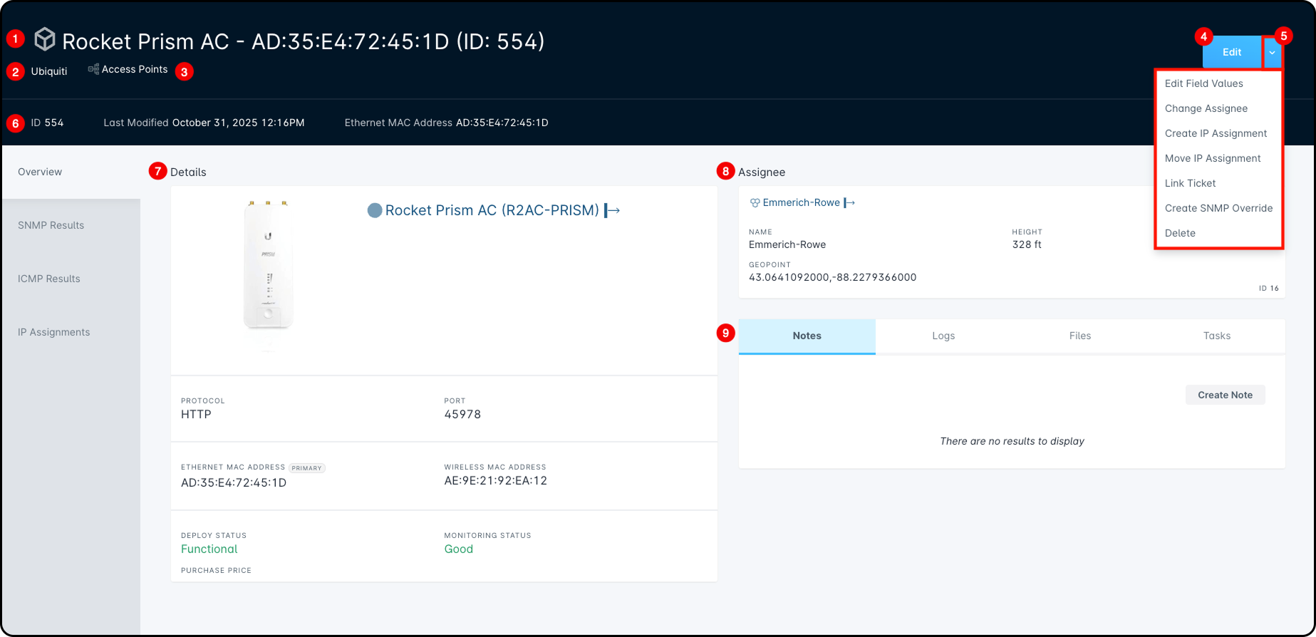 4. Assignee - details the current assignee and location of the inventory item, including the height the unit has been installed at (if applicable), as well as reflecting any other items at that location.