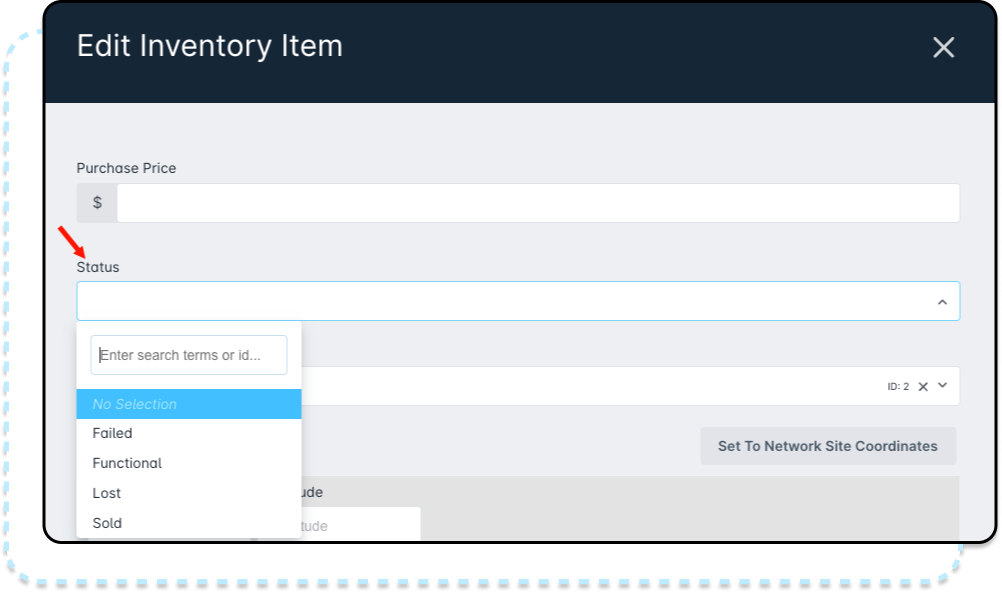 - Edit Menu: by clicking "Edit" you are able to edit an inventory item's purchase price, status, and deployment type, as well as set the inventory to the network site coordinates or input custom coordinates. These settings dictate where the equipment is visible on the Network Sites' network map page. For Fiber networks, this can be particularly beneficial to easily identify where items such as demarcation boxes are installed within the field.If inventory is moved from one network site to another, it'll automatically move to the new location on the network map. However, the visible coordinates will need to be manually set again.Through the adjacent downward arrow menu, you are provided additional actions which are listed below:
