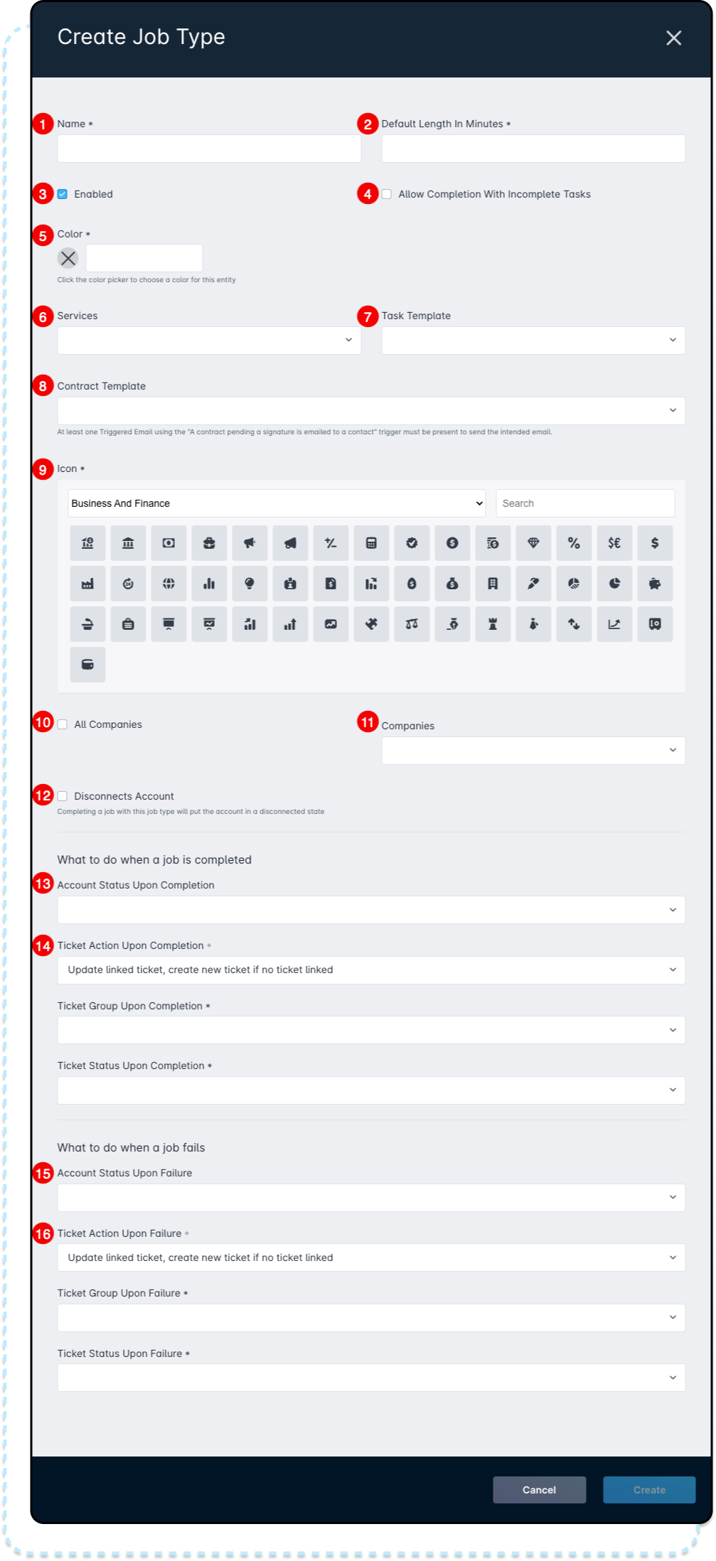 - The Default Length in Minutes field allows you to set a default length of time this job type is expected to take for successful completion. This value can be overwritten when creating the job and is used to calculate the availability of technicians.