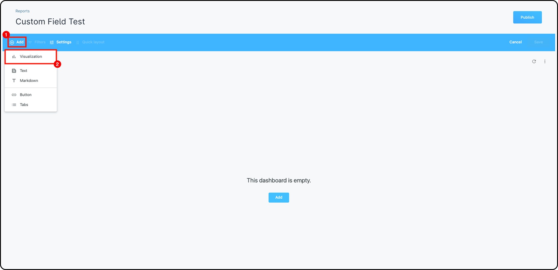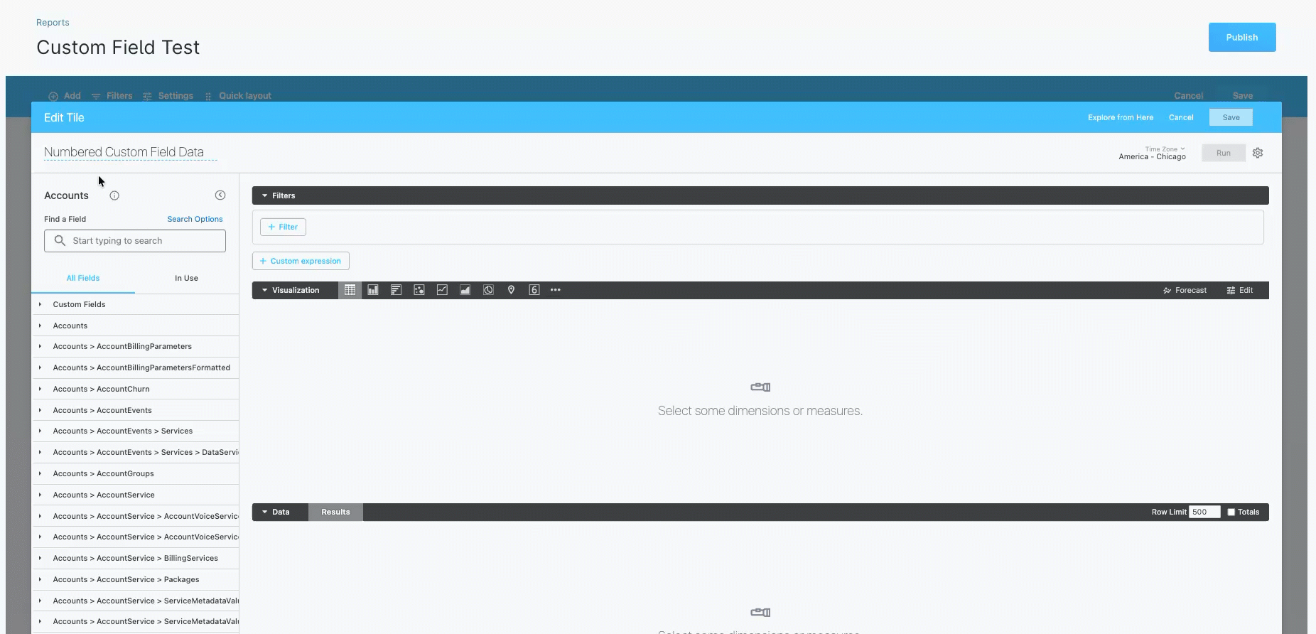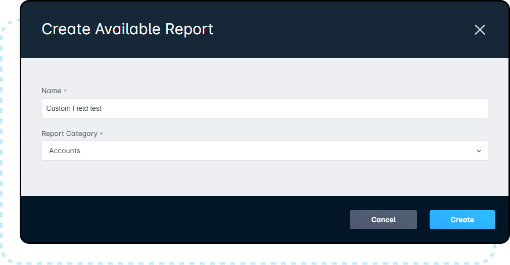 For this example, we’ll create a report named “Custom Field test” in the Accounts category.
