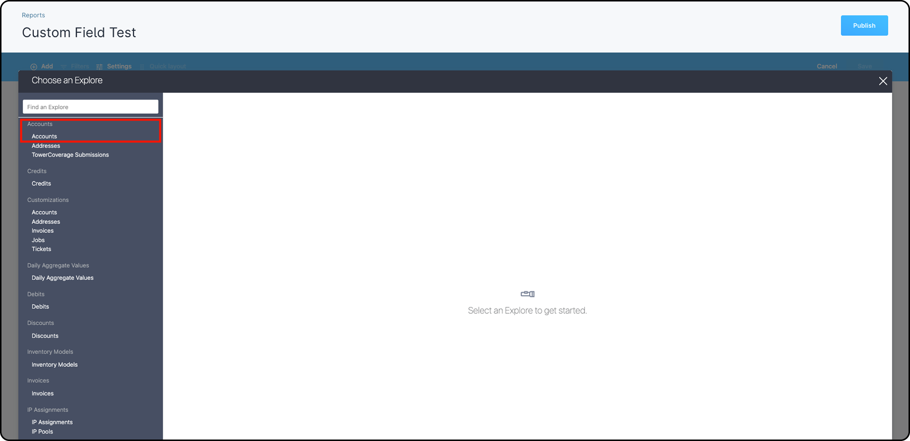 - In the Explore window, pick the explore group that fits your report. For this example, choose Accounts.
