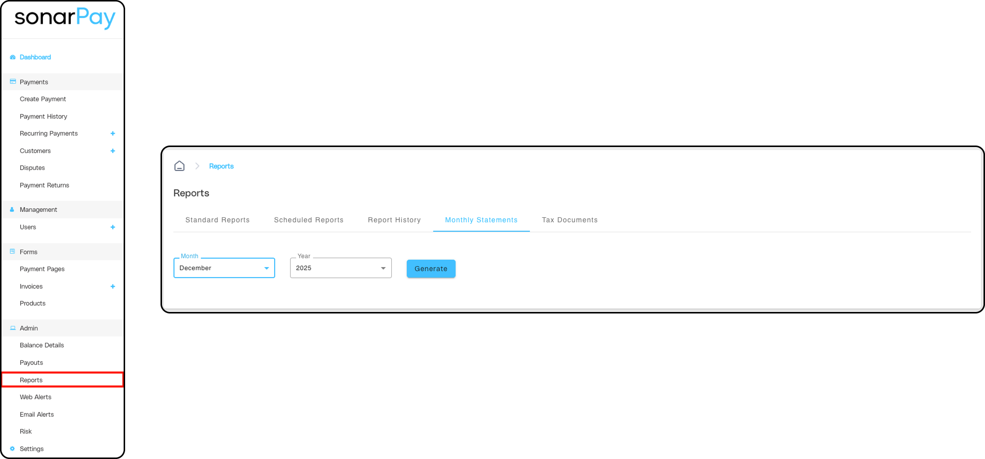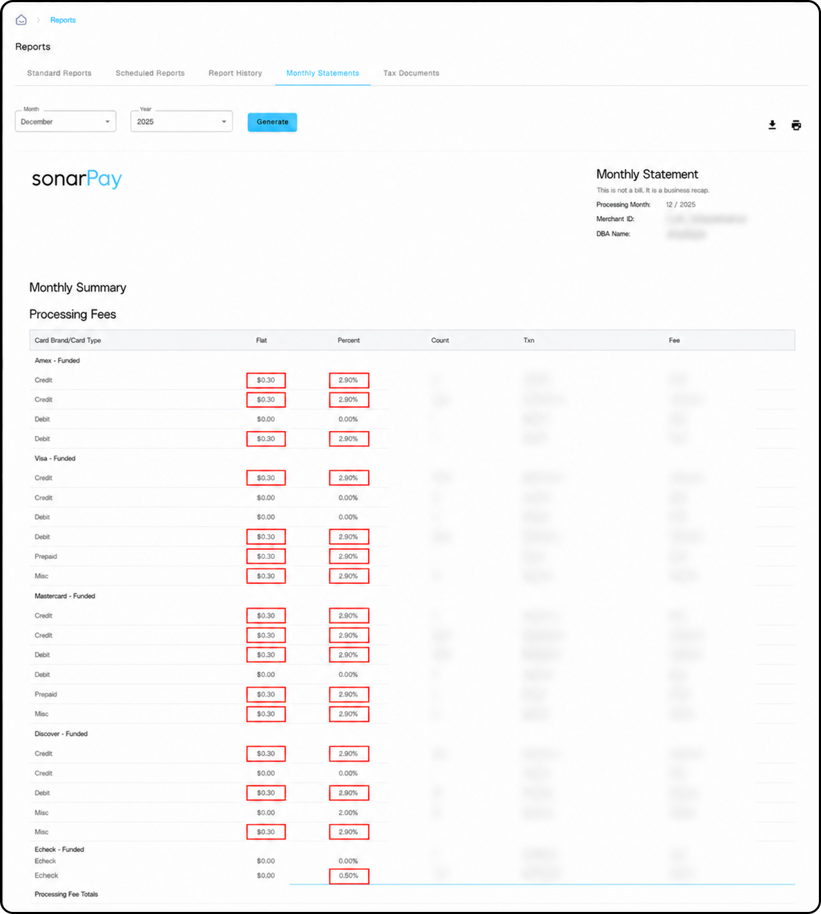 You can locate your processing rates by generating a Monthly Statement in the sonarPay portal. Be sure to select a complete billing month so the statement includes your rates and fees.