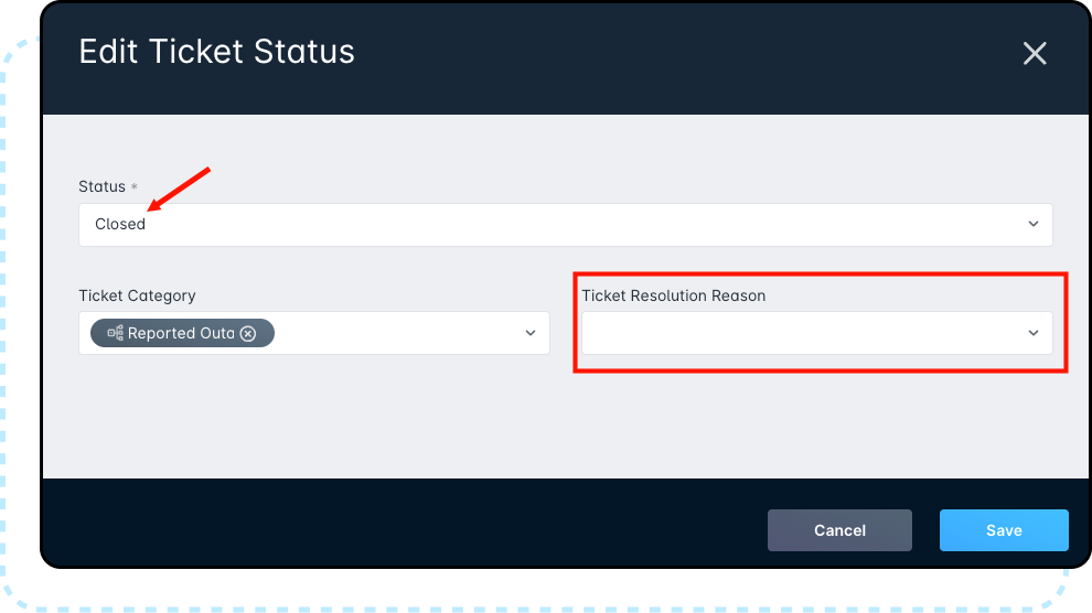 If Ticket Resolution Reasons are enabled in your system, you’ll see a field where you can select the resolution reason.