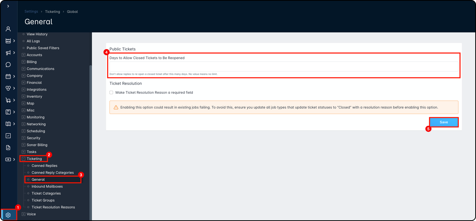 This setting applies to inbound email tickets only and lets you define how many days a ticket must remain closed before an email reply will stop reopening it (portal ticket workflows are not affected).