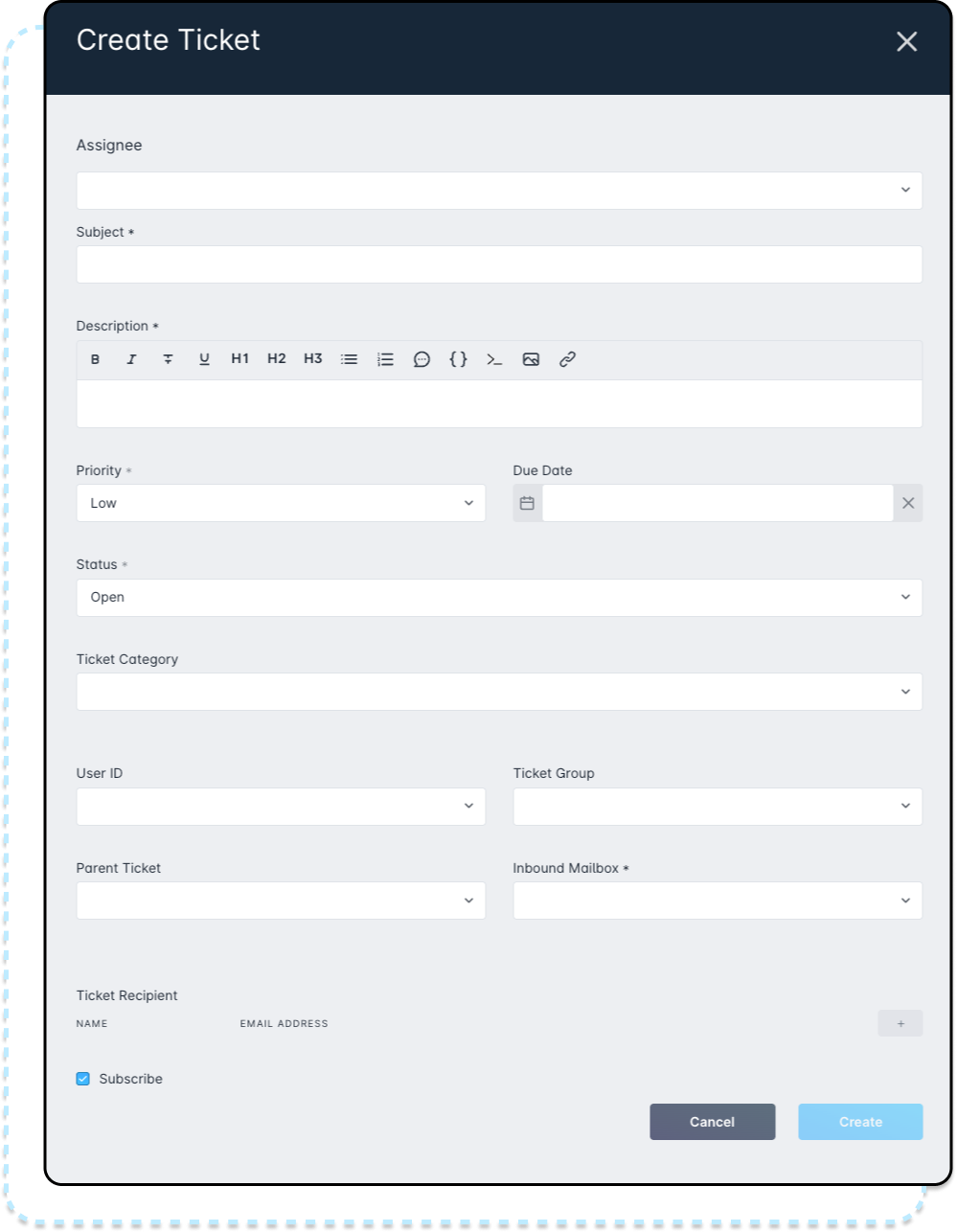- Subscribe: Check this box if you want to receive notifications about this ticket. Leave unchecked if you don’t.Internal tickets don’t show the Inbound Mailbox or Ticket Recipients fields.