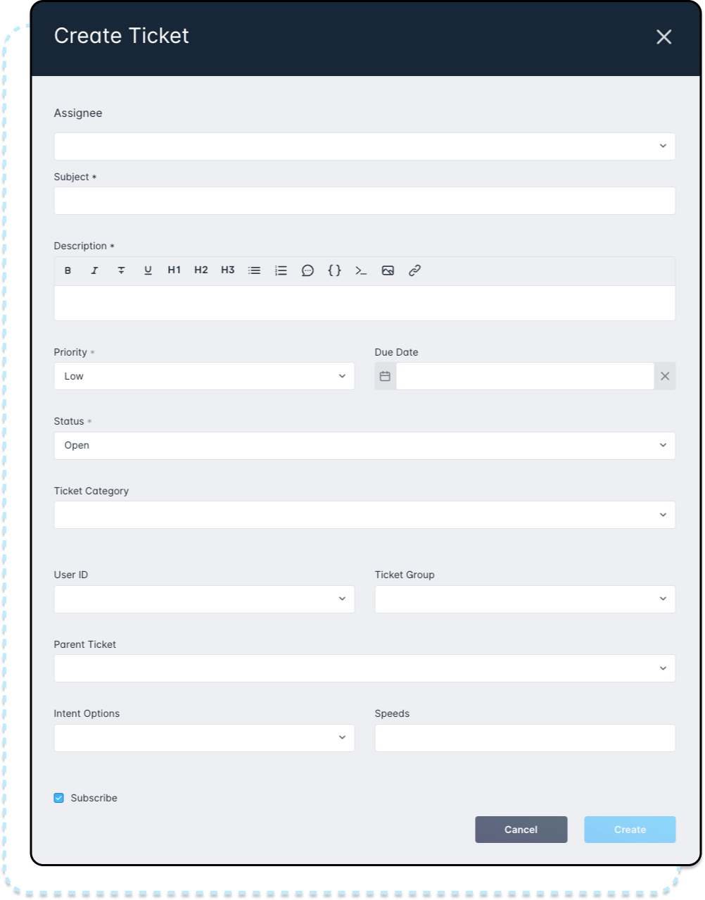 - Subject (Required): For public tickets, this is the email subject. For both public and internal tickets, it shows in the ticket overview.